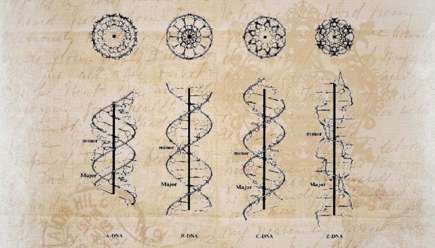 “Top and side views illustrating the characteristic features of regular helical structures of A, B, C and Z DNA deduced from representative X-ray fiber diffraction models (44,46). Ribbons trace the progression of the backbone defined by the phosphorus atoms and the heavy black lines (boxes) represent the helical axes.” 3DNA: A Software package for the Analysis, Rebuilding and Visualization of Three-Dimensional Nucleic Acid Structures. (Credit: Xiang-Jun Lu and William K. Olson, PubMed)
